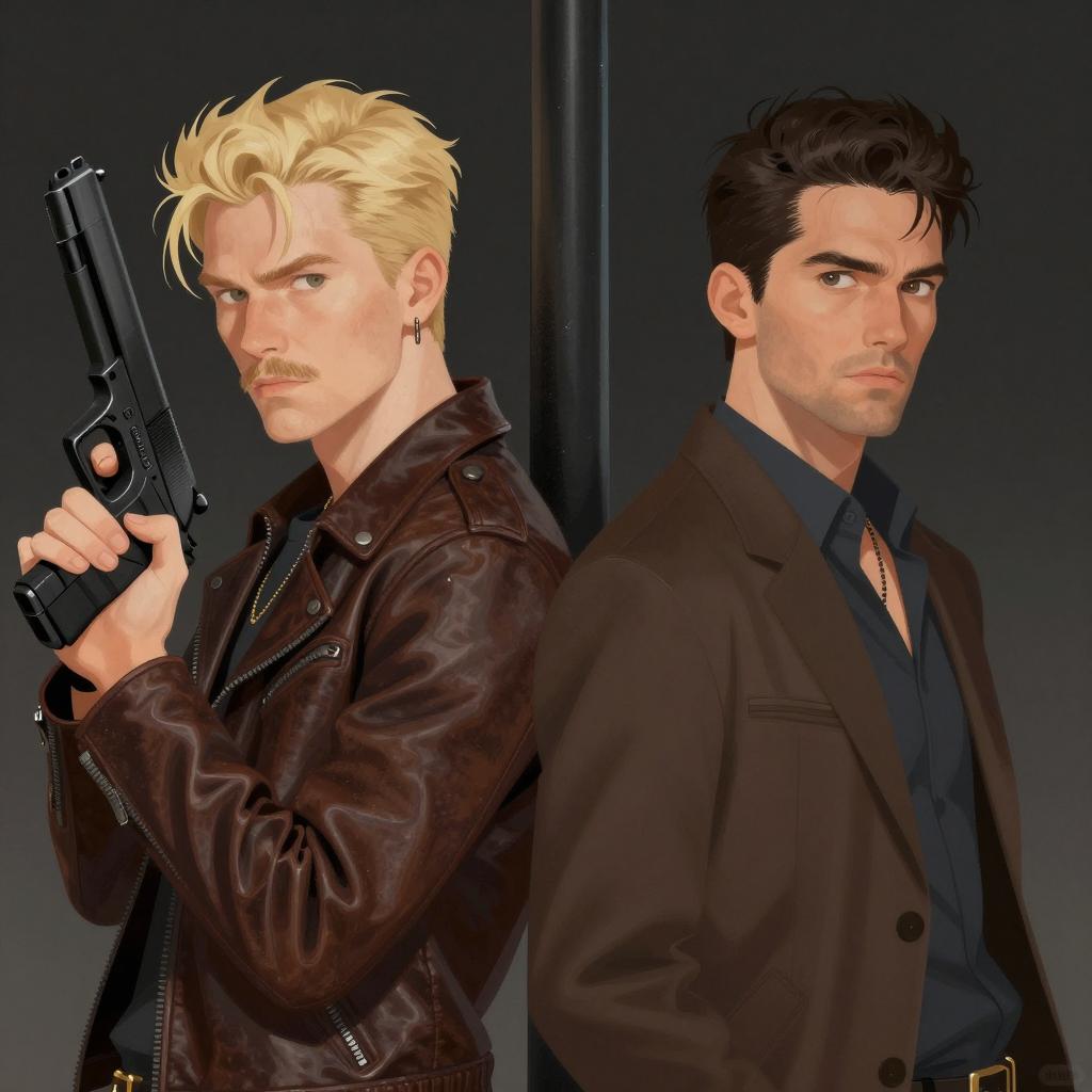Illustration of a man and a woman in a classic style. The man, in a dark gray suit and holding a silver handgun, looks to the side with a serious expression. The woman, with blonde, wavy hair, wears a black jacket and looks forward with a neutral expression. Both have light skin. The background is a solid light blue. The man is in the foreground, slightly to the left, while the woman is behind him, to the right.