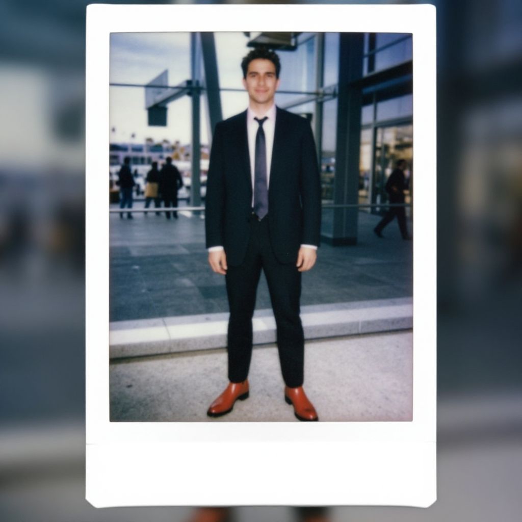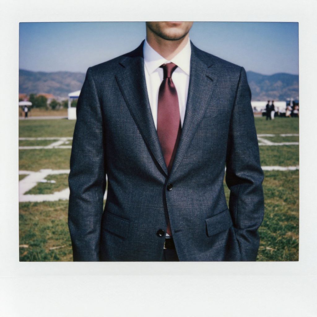 A man, heritage check wool suit, tailored fit, deep navy and charcoal tones, crisp white dress shirt, silk tie in burgundy, outdoor runway, bright white markings, surrounded by green grass, distant mountains, clear blue sky, polaroid instant camera style, confident expression. Man has masculine face and piercing eyes