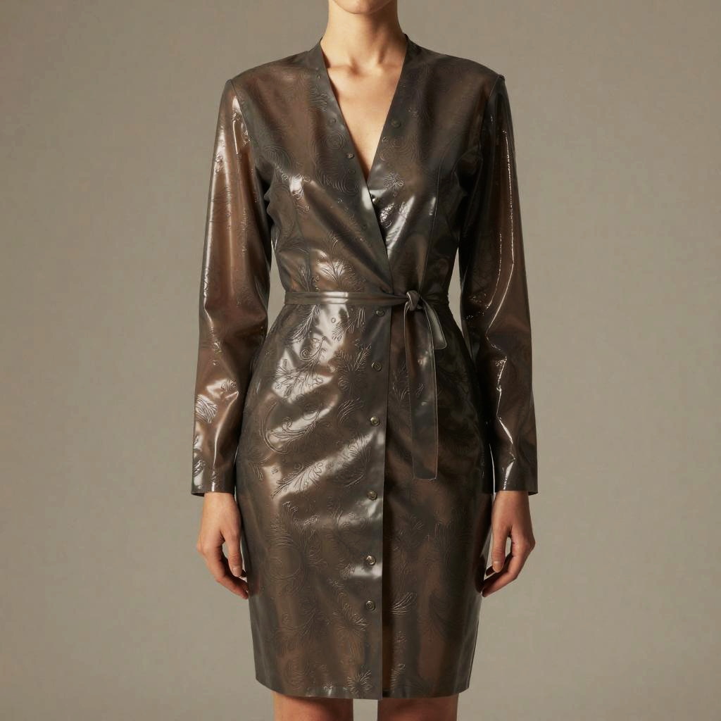 Latex robe detailed with intricate embossed patterns, tightly fitted silhouette reflecting soft ambient lighting, styled in a high-fashion editorial studio setting