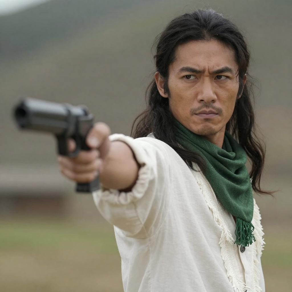 Photograph of a young Asian man with dark hair in a side ponytail, wearing a patterned shirt and brown vest, holding a longbow and arrow. He stands in profile, looking forward. In the blurred background, a large herd of dark brown horses stands in a grassy field. The image has a warm, yellowish tint.