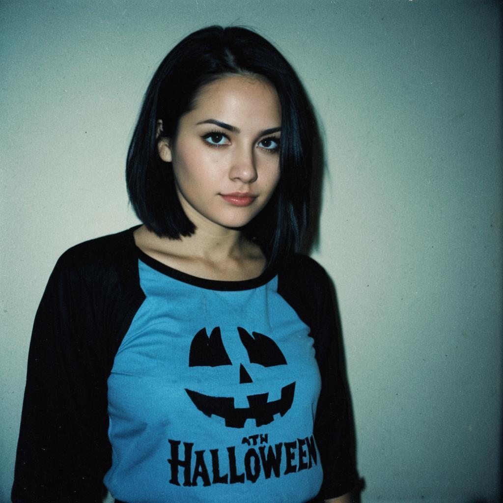 Photograph of a young woman with fair skin and straight black shoulder-length hair, standing against a plain, slightly textured light gray background. She has dark, well-defined eyebrows and wears subtle makeup with a natural look. She is dressed in a light blue raglan shirt with black sleeves, featuring a large black Jack-o'-lantern face and the text "Halloween" beneath it. Her expression is neutral, and she gazes directly at the camera. The lighting is even, highlighting her facial features and the vibrant colors of her shirt. The image has a slightly grainy texture.