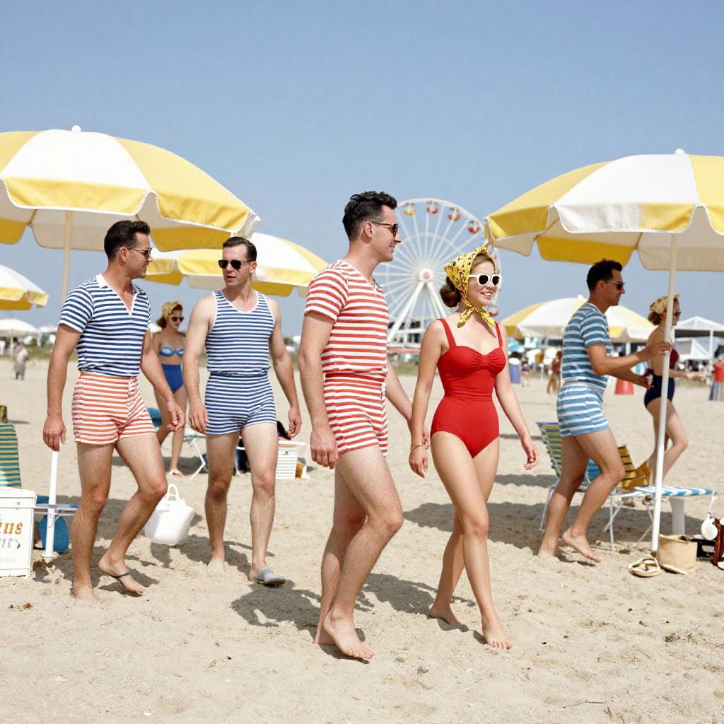 1950's outfits casual day at the beach, men in striped swimsuits and women in modest one-piece bathing suits with headscarves, vintage beach umbrellas and ferris wheel in the distance, bright summer colors, lively atmosphere with retro vibe