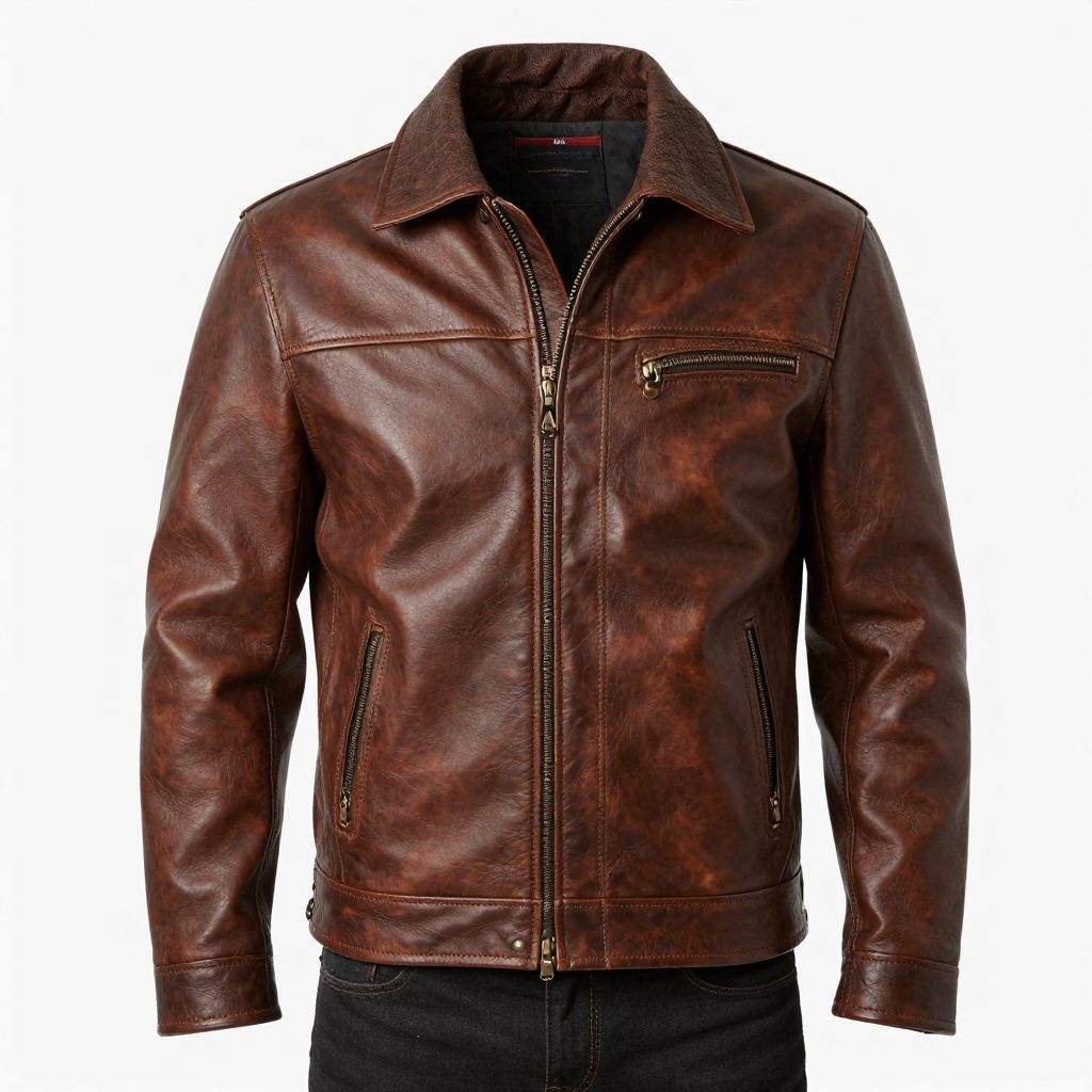 Photograph of a brown, distressed leather biker jacket with a collar, zipper front, chest pocket, and black jeans underneath.