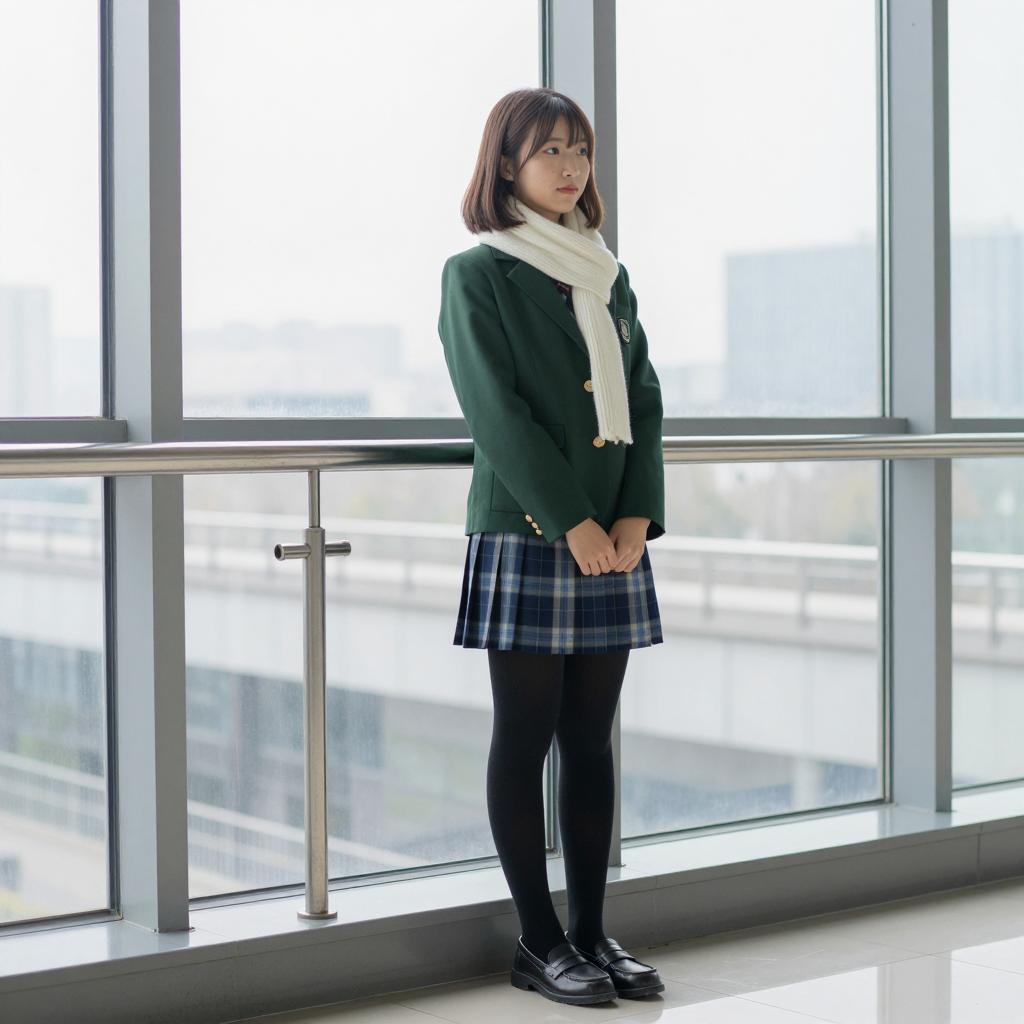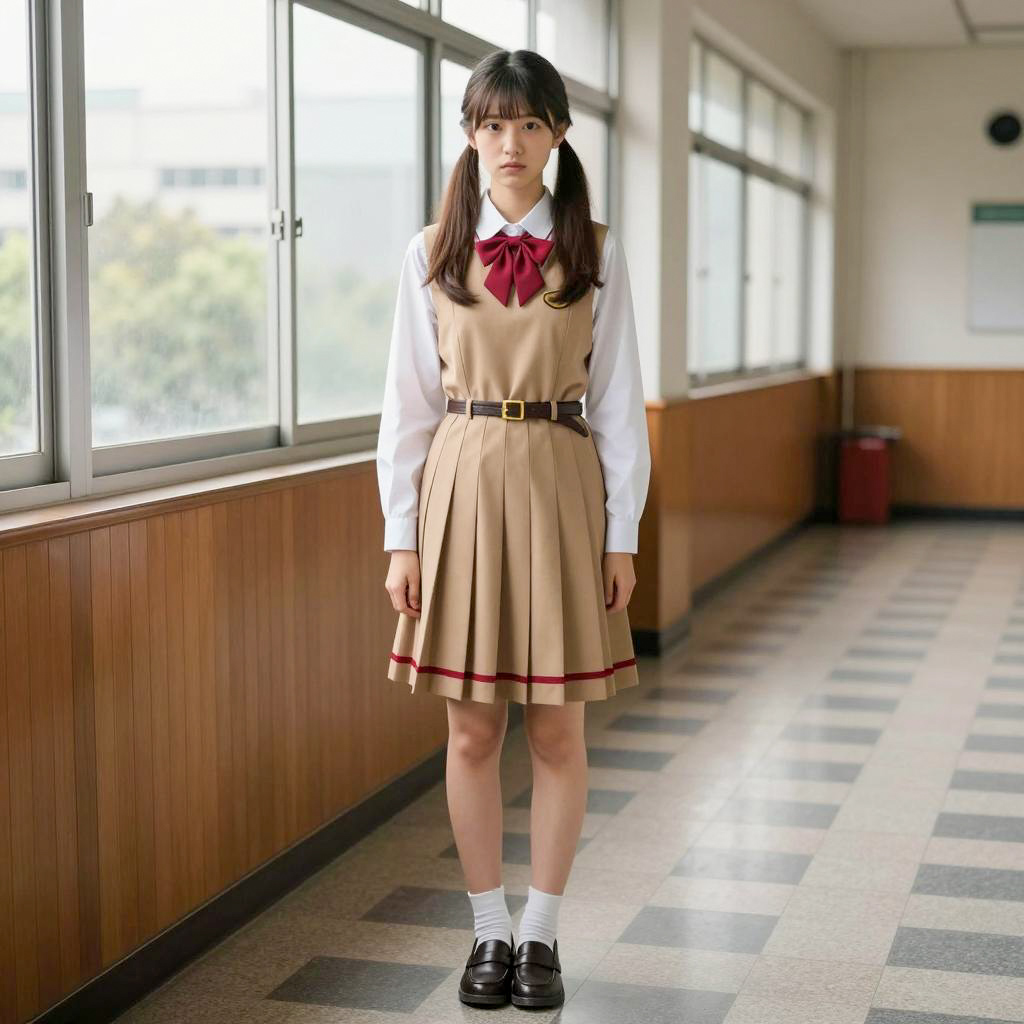 Japanese woman with black pigtails, red cardigan, white blouse, red plaid skirt, black shoes, white socks, sitting on school desk. Background: large window with light coming through, beige curtains on the left. Desk and chair in front of radiator. She looks down, smiling slightly. Natural light.
