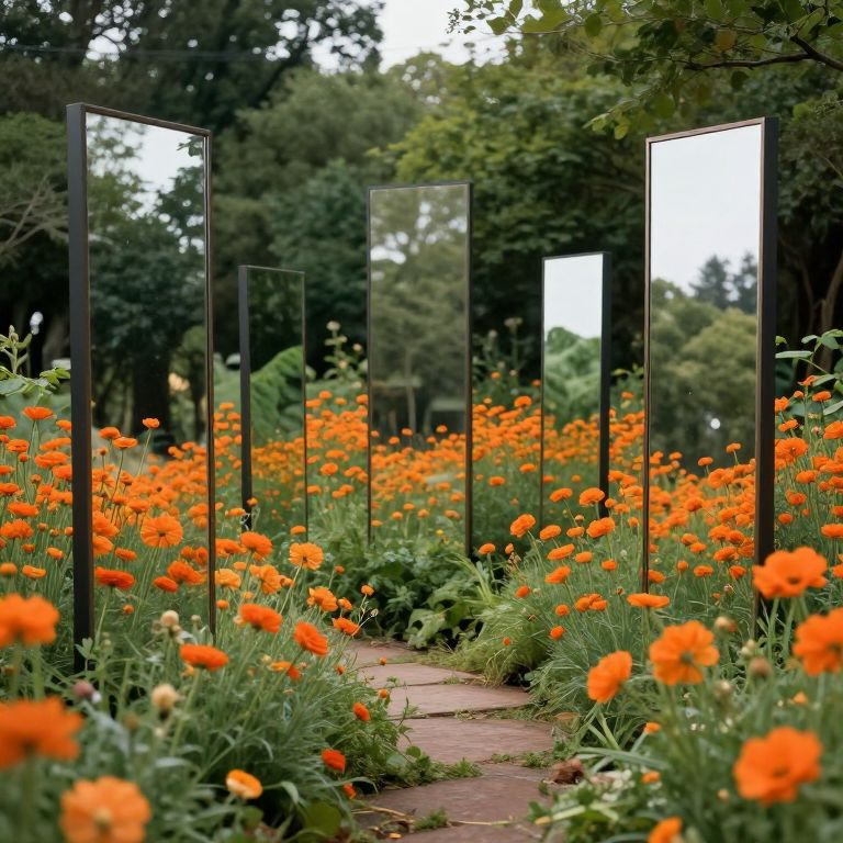 Sentient Mirrors Among Vibrant Flowers