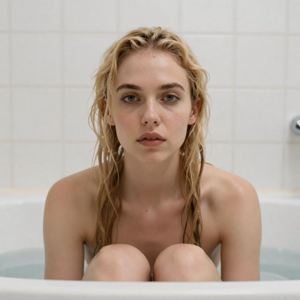 Blonde woman in a white bathtub, wearing a green floral top and beige cardigan, looks up with a concerned expression. Wood-paneled wall in background, dried flowers and candles on right. She sits with knees up, hands on the edge. Soft lighting.