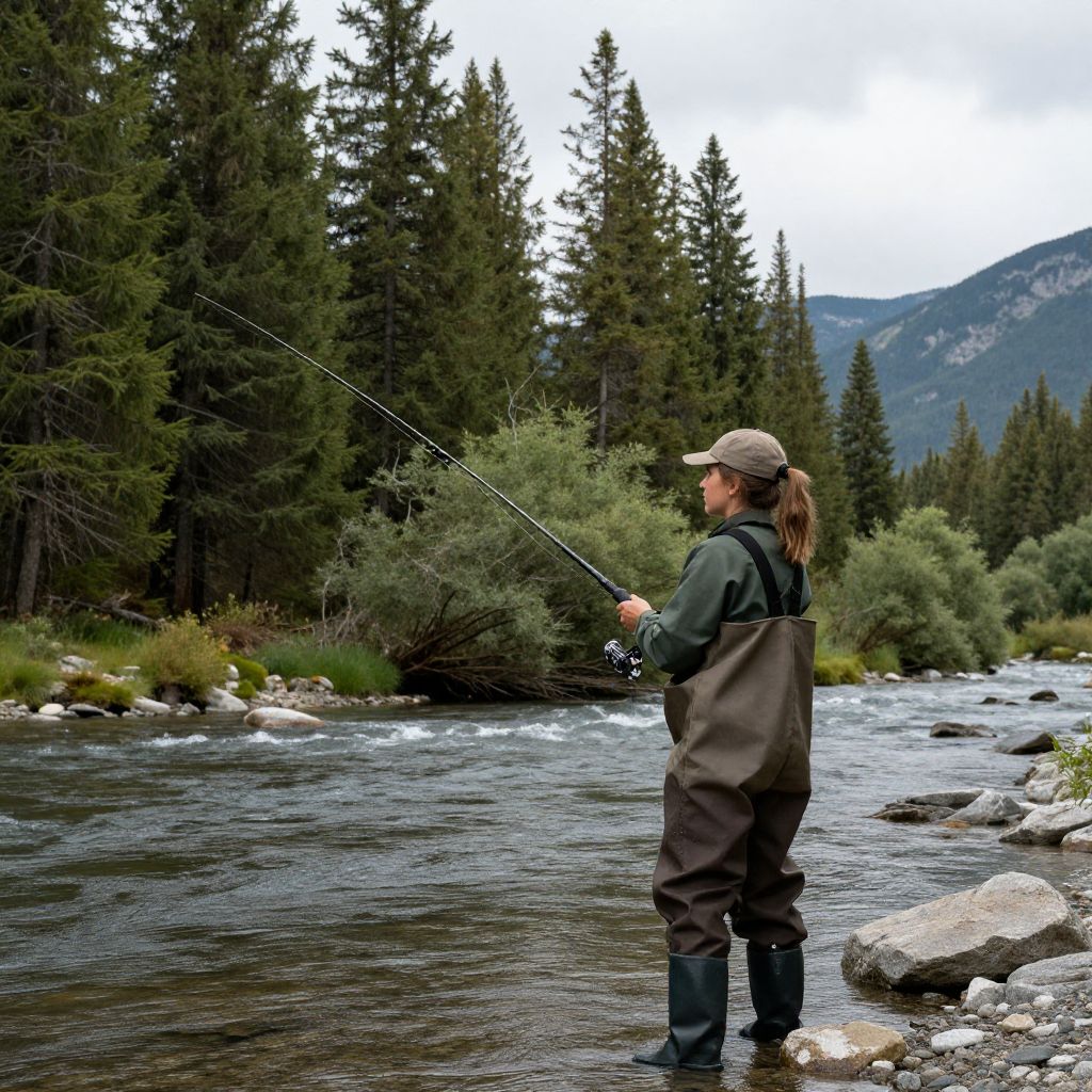 Woman fishing in a serene river, clad in waterproof green overalls and brown hip waders, casting her line amidst a backdrop of dense evergreen trees and distant mountains under a cloudy sky.