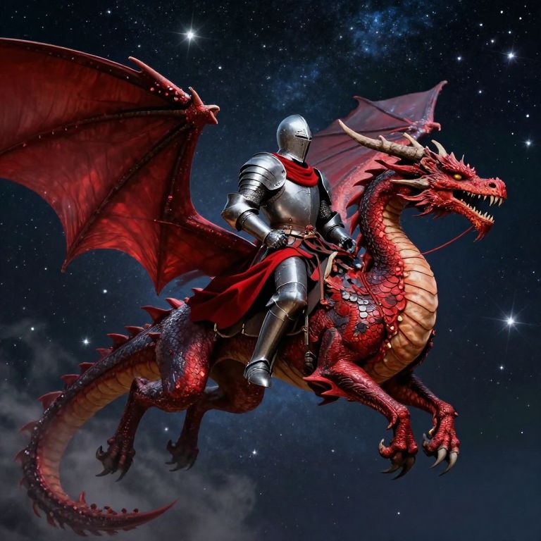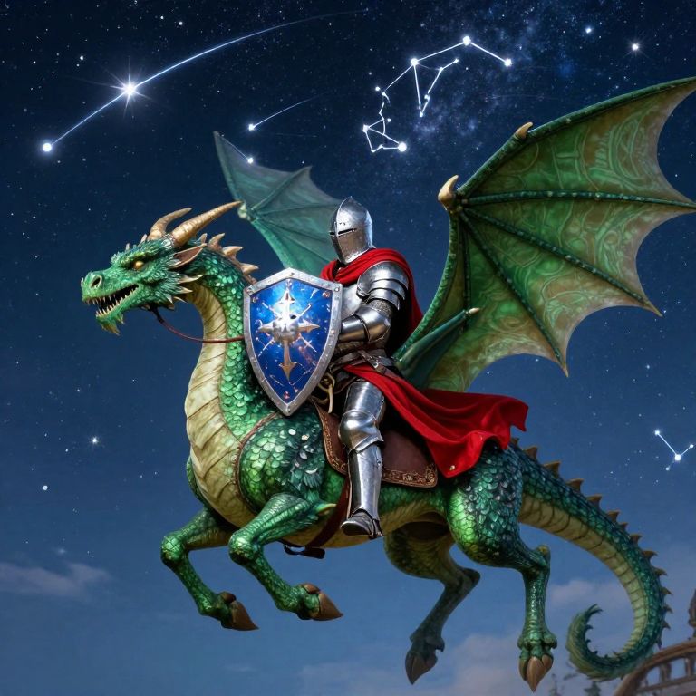 Digital illustration of a knight in shining armor with a red cape, riding a green, scaly dragon. The knight holds a blue shield with a white star emblem and a silver sword. The dragon has large, green wings with a gold membrane, and sharp, golden horns. The background is a starry night sky with a constellation pattern visible. The knight's armor is highly detailed, and the dragon's scales are textured. The image has a fantasy theme, with vibrant colors and dynamic composition, capturing a moment of heroic valor.