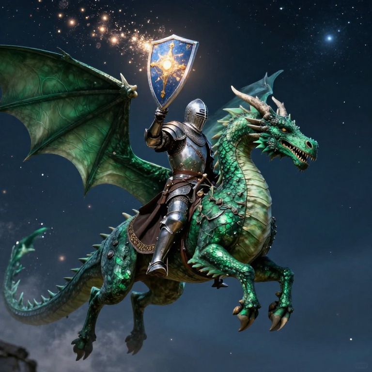 In a fantastical digital artwork, a medieval knight clad in gleaming armor and draped in a vibrant red cape rides a majestic green dragon through a starry sky, wielding a radiant shield that defies celestial phenomena as shooting stars and constellations streak across the heavens.