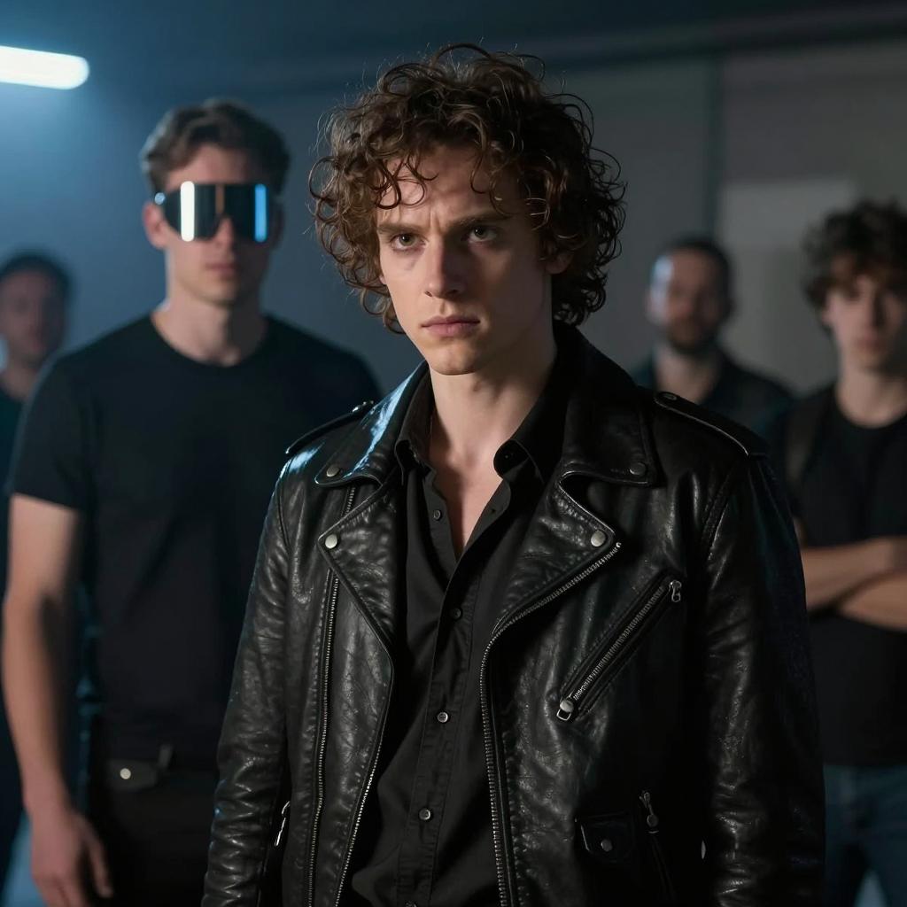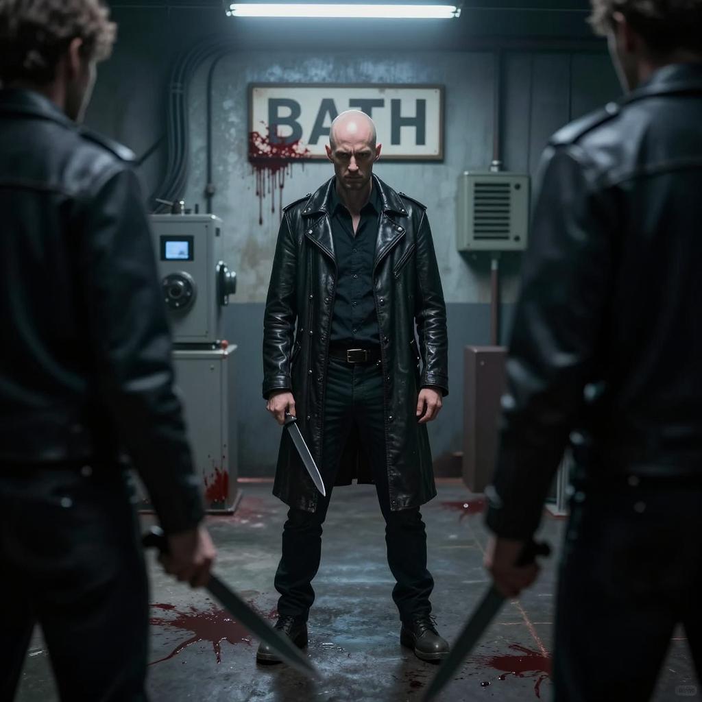A dimly lit industrial room. Central figure, bald man in black leather coat, holding a knife, stands facing two partially visible figures in front. Bloodstains on floor and wall. "BATH" sign with blood in background. Cool blue light. Two figures on left and right, blurred, holding knives. Industrial equipment and cables in background.
