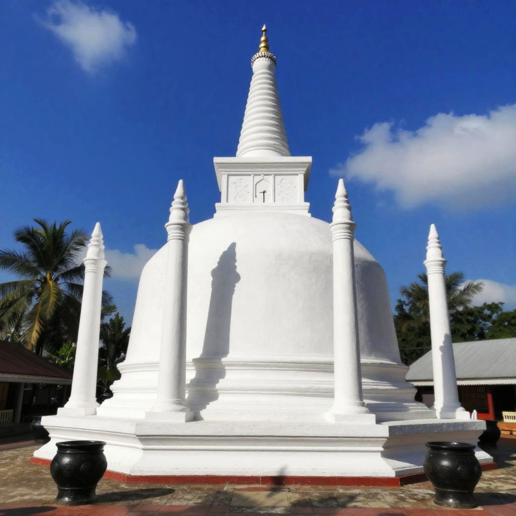 This is a colorful photograph of a bright white Buddhist stupa with a tall, pointed dome and four tall, cylindrical columns in front. The stupa is illuminated by sunlight, casting shadows on the ground. In the background, there's a clear blue sky with a few clouds, and a few palm trees are visible. The foreground has two black, ornate pots. The image has a slightly blurry effect.