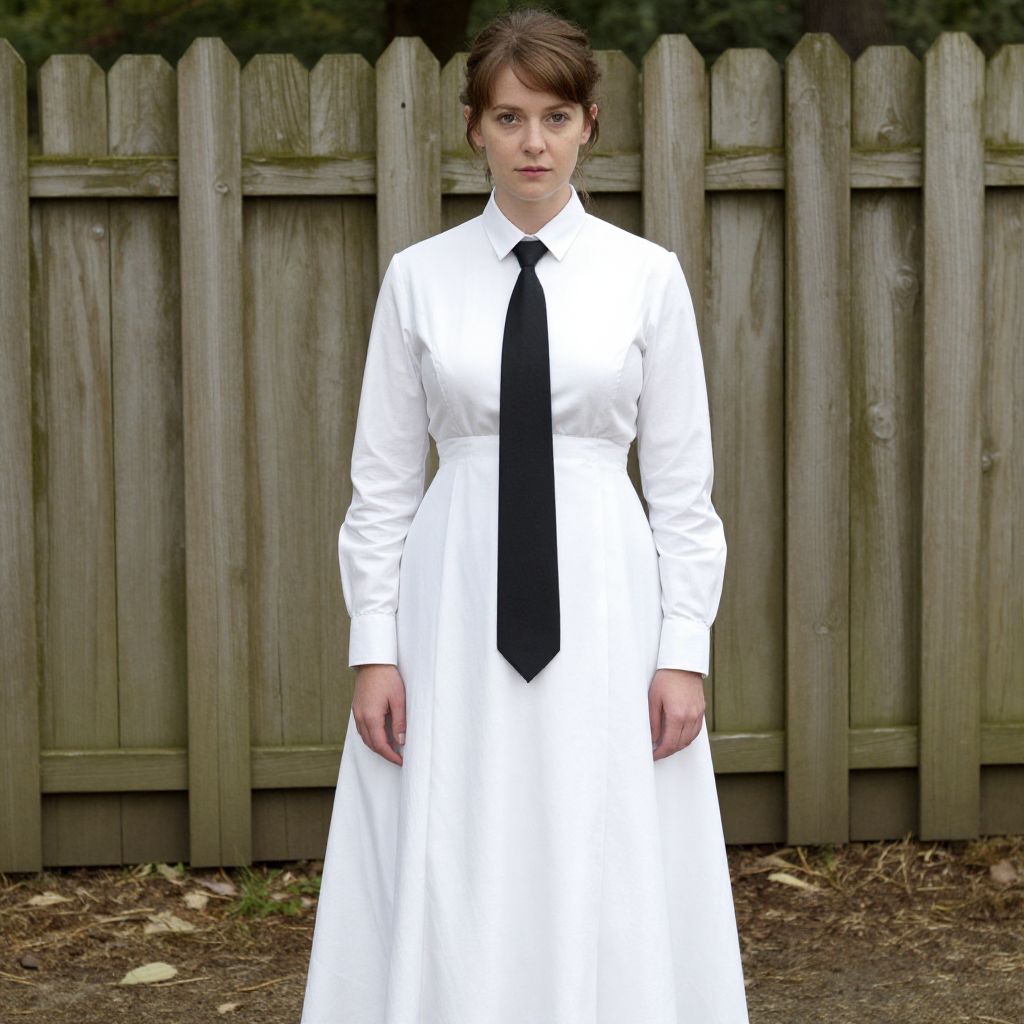 Photograph of a young woman standing in front of a weathered wooden fence. She has fair skin, brown hair styled in a simple updo, and is wearing a long-sleeved, white dress with a black necktie. Her expression is neutral, and she stands with her hands by her sides. The dress has a fitted waist and a full skirt, giving a modest, vintage look. The wooden fence behind her is aged with visible cracks and a rustic texture. The ground is covered in brown leaves, indicating an outdoor setting in autumn. The overall composition is simple, focusing on the contrast between her white dress and the dark fence.
