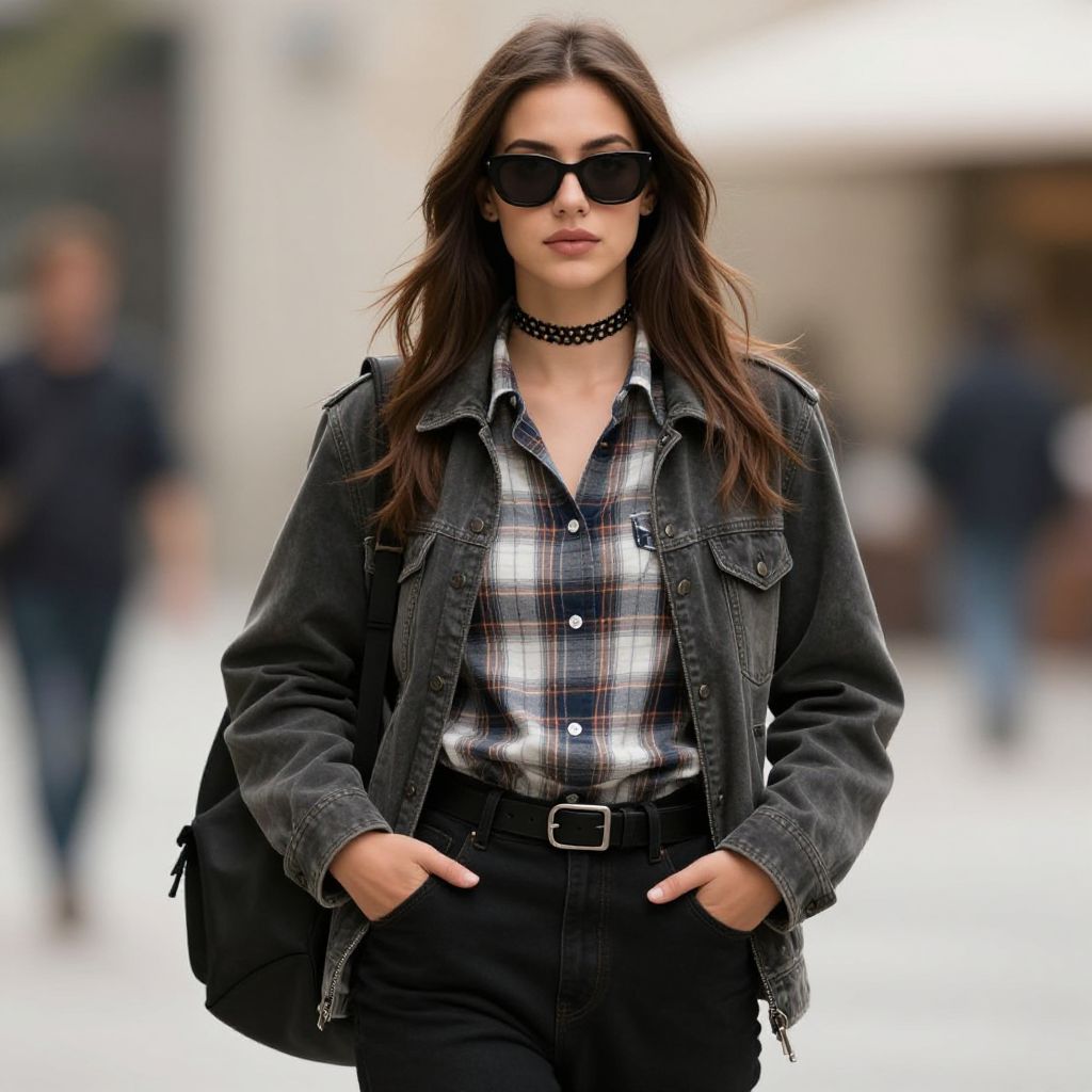 A woman, styled in an Eastman reversal film stock aesthetic, wearing a sleeveless black top with graphic text tucked into burgundy coated skinny jeans, complemented by a black belt with chain accent and oversized black sunglasses, enjoying an evening stroll in a cherry blossom grove. Sexy. Pretty face and beаutiful eyes. Big breasts