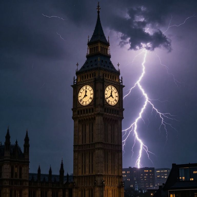 Amidst the tempestuous dance of lightning, the clock tower stands as a paradoxical sentinel of time, its luminous face piercing the stormy veil, symbolizing the eternal struggle between chaos and order, while the crackling air whispers the transient beauty of moments caught between silence and thunder.