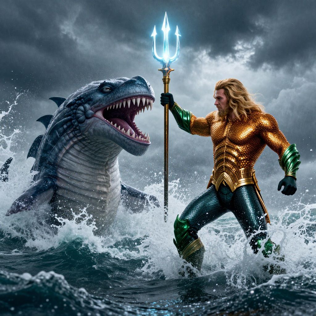 Action scene of blonde Aquaman battling sea monsters in stormy seas, dynamic movement with splashes and swirling waves, glowing trident emitting light, dark ominous sky contrasted with bright armor, epic fantasy confrontation, dramatic poses and detailed textures, heroic and vibrant composition