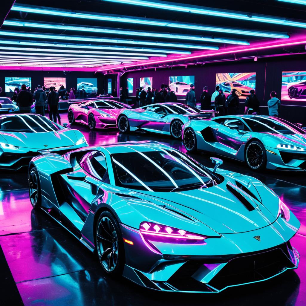 A high-tech sports car exhibition featuring sleek futuristic monolithic cars illuminated by dynamic cyan and magenta neon lights. The showroom ambiance is aggressive and dystopic, with hyper-realistic, cinematic lighting reflecting off the polished surfaces of the cars. People in the background admire the vehicles, and the entire scene evokes a graphic novel style with ultra-detailed visuals.