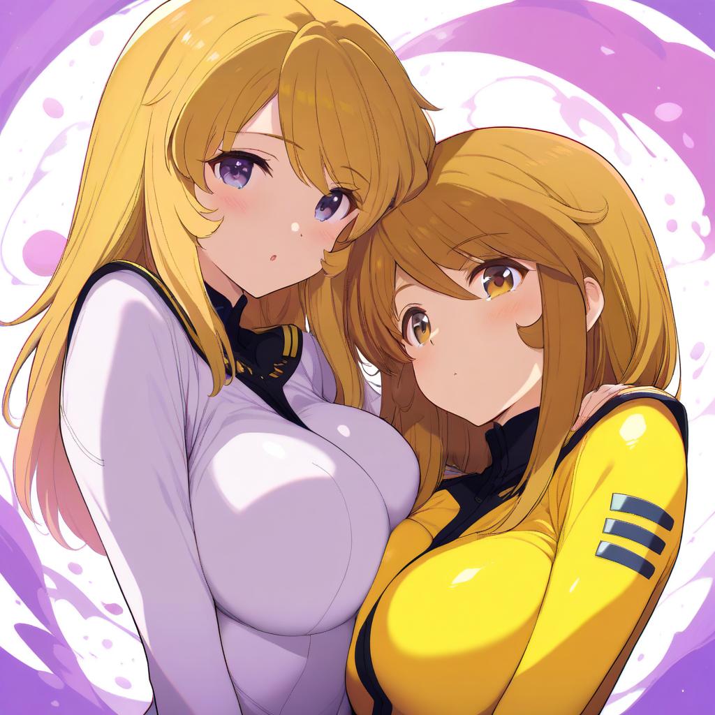 Digital illustration of two anime girls with long hair and medium to large breasts. One girl has blonde hair and purple eyes, wearing a white bodysuit with black and yellow accents. The other girl has brown hair and brown eyes, wearing a yellow bodysuit with black stripes on the sleeves. The background features abstract purple and white swirls.