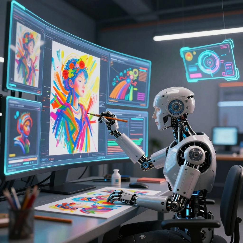 CGI image of a white, humanoid robot artist creating vibrant, digital art on multiple screens in a futuristic studio.