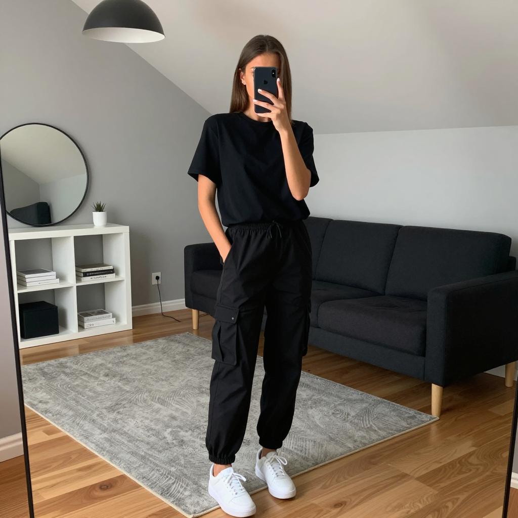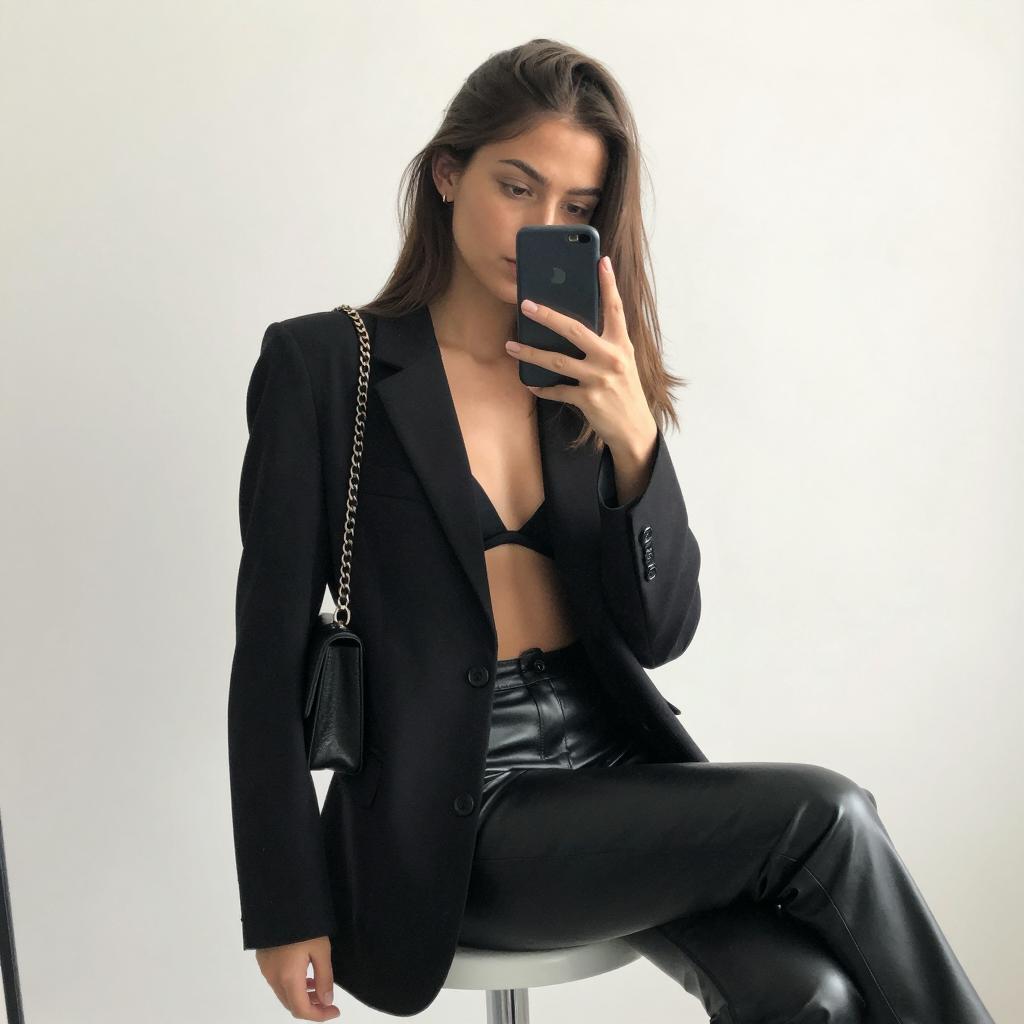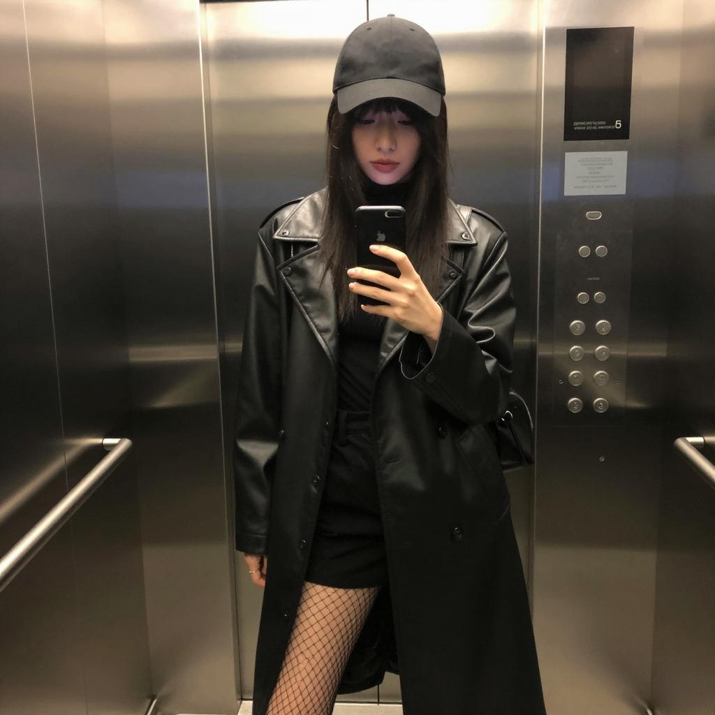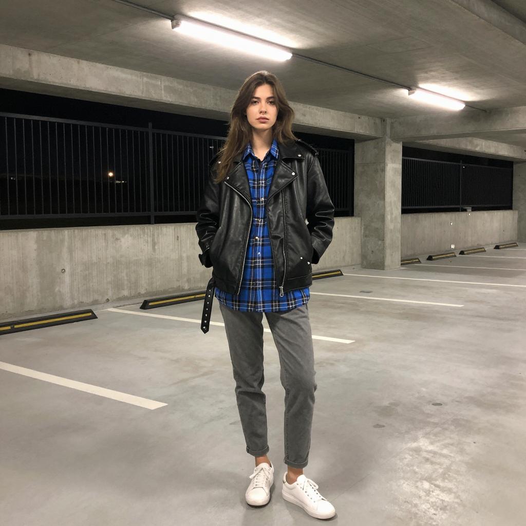 Young woman with long brown hair, wearing a black leather jacket, blue plaid shirt, gray pants, and white sneakers. Standing in a concrete underground parking garage. Overhead fluorescent lights. Neutral facial expression. Concrete pillars and dark metal fence in background. Hands in jacket pockets. White and gray floor. Single white ceiling light.