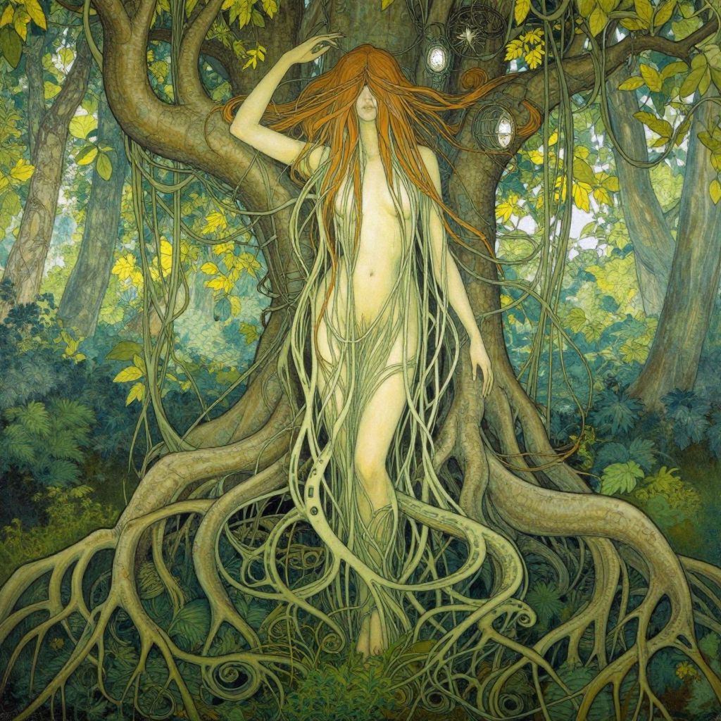 Vibrant, surreal Art Nouveau-style illustration: Red-haired woman in white dress, shirtless curly-haired man in loincloth, mystical central