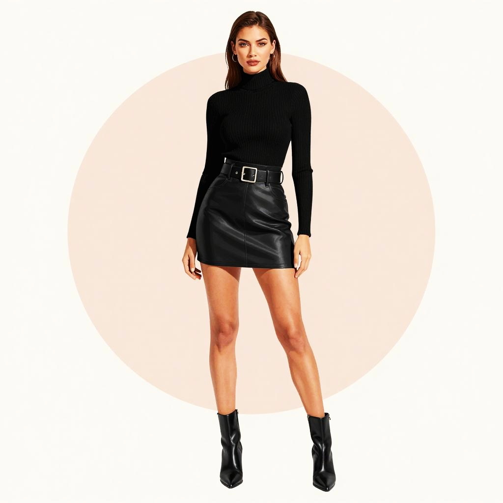 Pregnant fashion, woman with elegant braided updo and long-limbed runway-model build with maternity curves, in an all-black outfit, sleek monochrome style: fitted black turtleneck sweater hugging the bump, structured black leather moto jacket, black ribbed knit midi skirt hugging the curves, black combat boots with laces and thick soles, casual-cool city style with relaxed tailoring, standing in warm beige studio wall with gentle falloff studio background, high-end maternity fashion photography, soft flattering lighting, high resolution, ultra-detailed