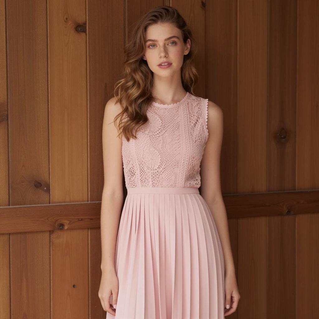Petite dress, photograph of a young woman with light brown wavy hair, standing in front of a wooden wall, wearing a sleeveless pink dress with lace detailing on the neckline and pleated skirt, natural light, neutral expression, soft focus, daytime, casual style, realistic, portrait, frontal view, background wood ure, simple and elegant outfit
