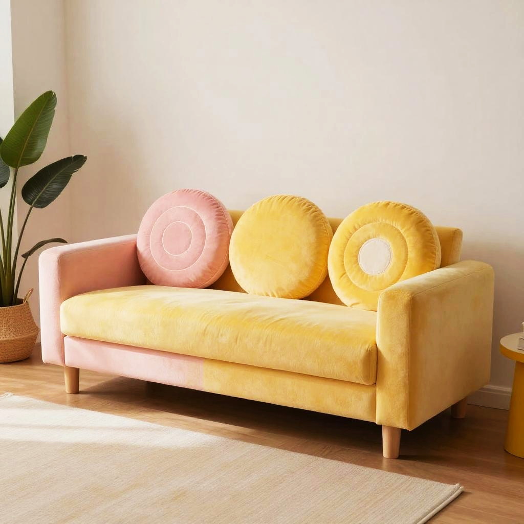 Lollipop sofa in a vibrant retro living room, colorful round cushions, playful shapes, pastel pinks and yellows, soft lighting, modern whimsical interior design style