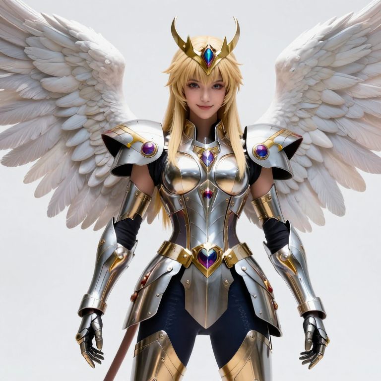 A highly detailed, super elite anime angel with large wings, a kind smile, and intricate armor stands confidently.