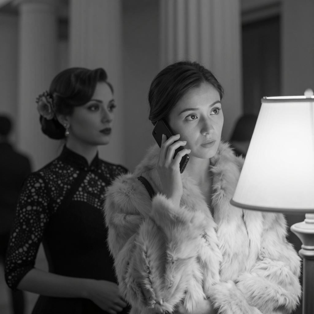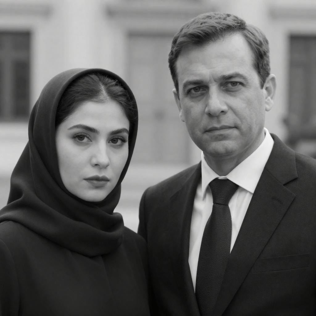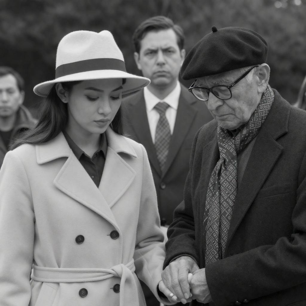 Black-and-white photograph. Young woman in light coat and wide-brimmed hat with dark band, looking down. Elderly man with dark beret, glasses, and patterned scarf, holding her hand. Middle-aged man in suit and tie, standing behind them, looking serious. Outdoor setting with trees in background. Elderly man's intense focus on young woman's hand. Young woman's calm expression.