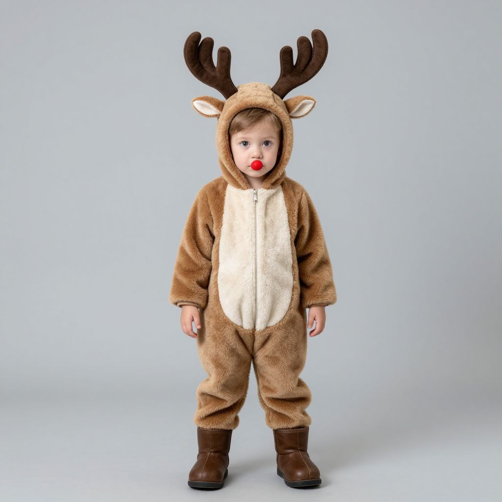 Toddler deer costume, solo, 1boy, male focus, animal costume, antlers, full body, reindeer costume, standing, boots, horns, cosplay, grey background, red nose