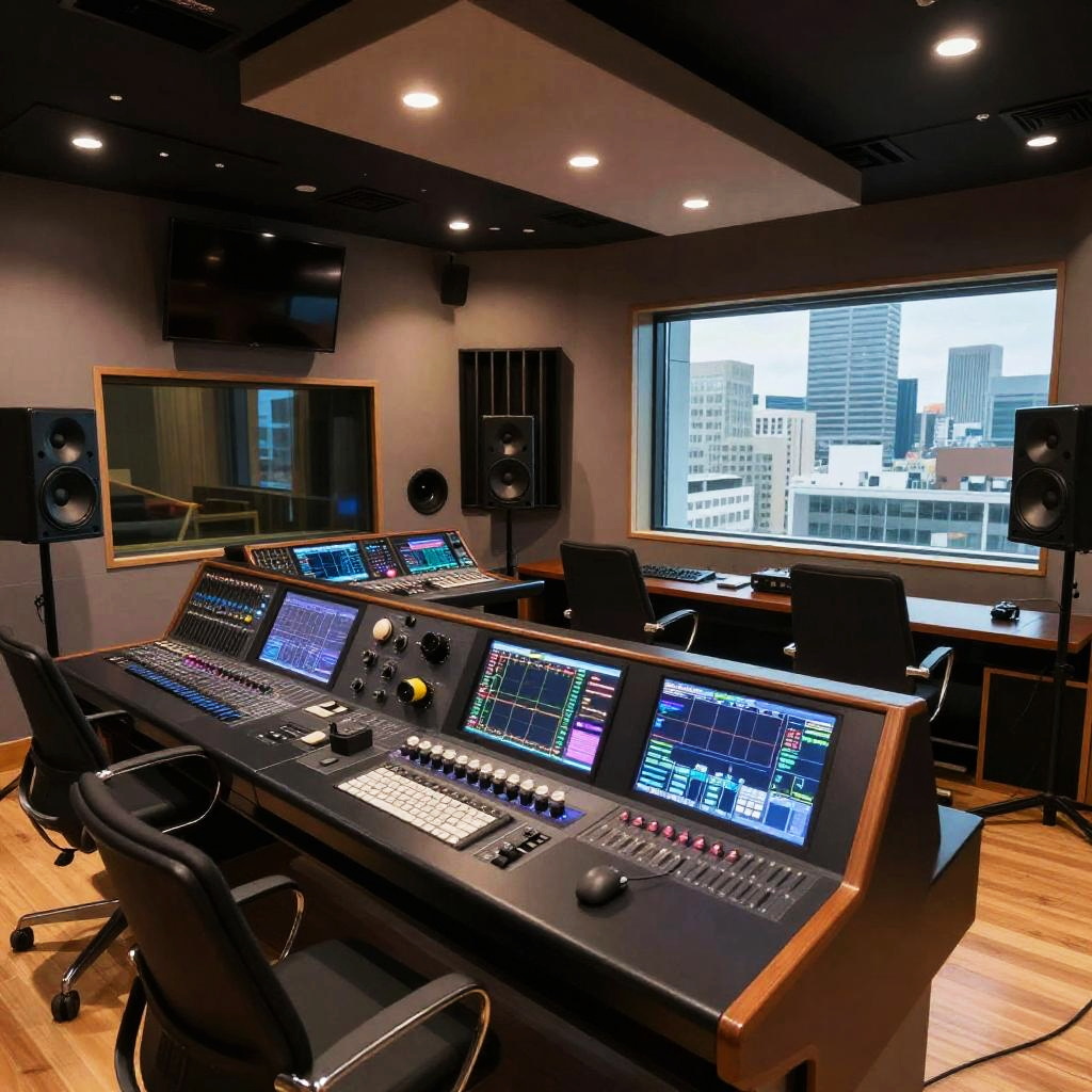 Futuristic luxury recording studio filled with smart digital consoles, immersive ambient lighting, sleek OLED touch screens, sound optimization technology, and large floor-to-ceiling windows offering panoramic urban views.