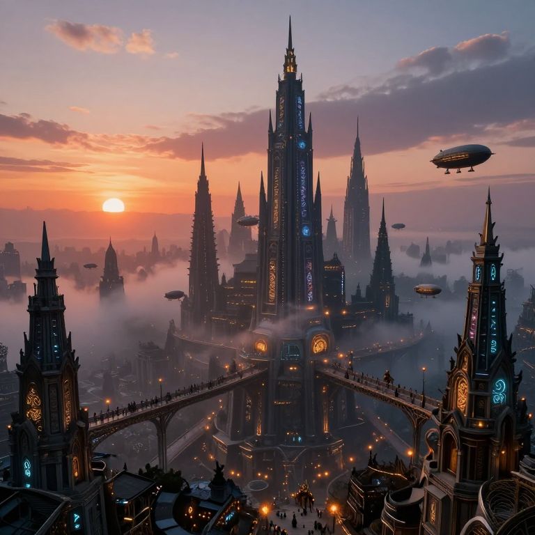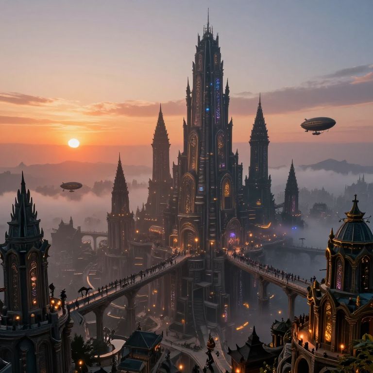 Digital fantasy artwork of a grand, Gothic-style city at sunset, with illuminated spires, mist, flying zeppelins, and vibrant orange-p