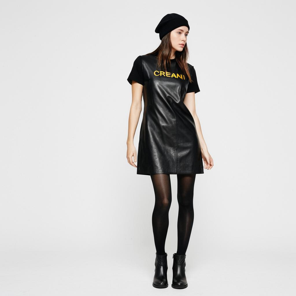 Woman, street style, short black leather shift dress, cap sleeve, simple crew neck, straight-cut hem, sheer black tights, black ankle boots with block heel, black beanie with embroidered yellow logo, clean white studio background.