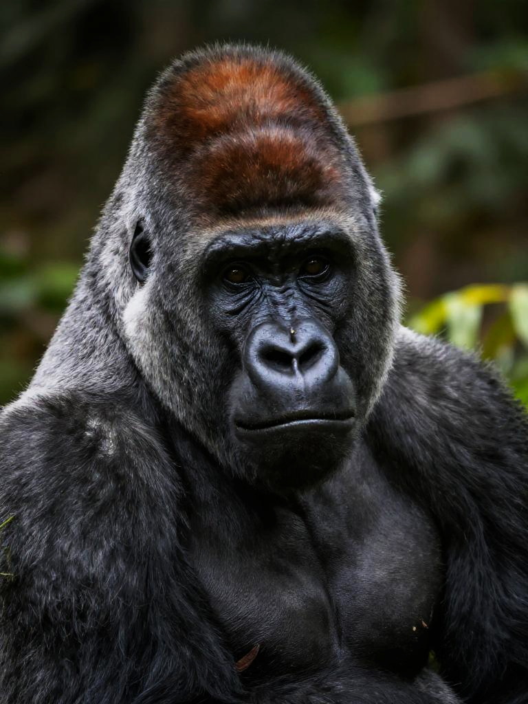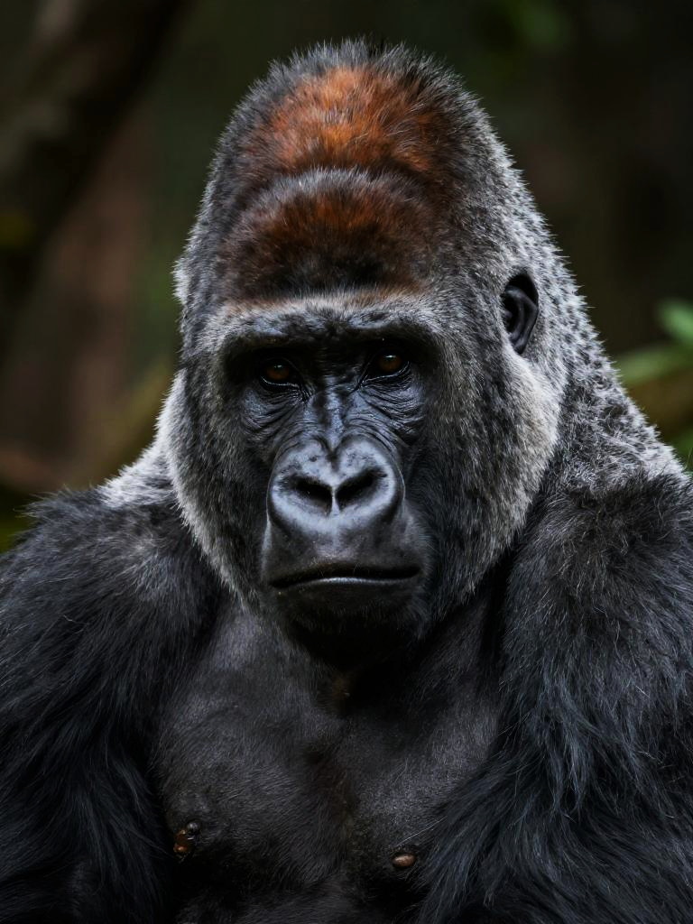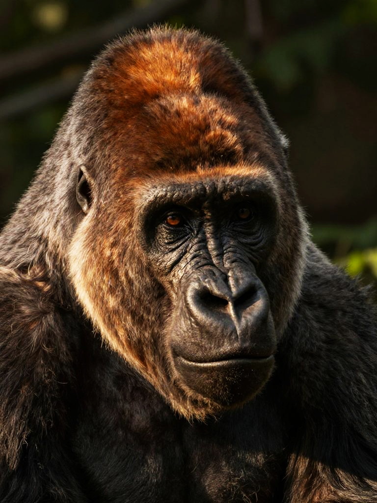 Close-up snow leopard portrait, mountain gorilla, warm brown fur with gray muzzle, calm thoughtful gaze, highly detailed face with visible texture and wrinkles, dramatic side lighting with deep shadows, rocky habitat with muted colors, natural wildlife photography look, sharp focus on eyes, shallow depth of field, high resolution