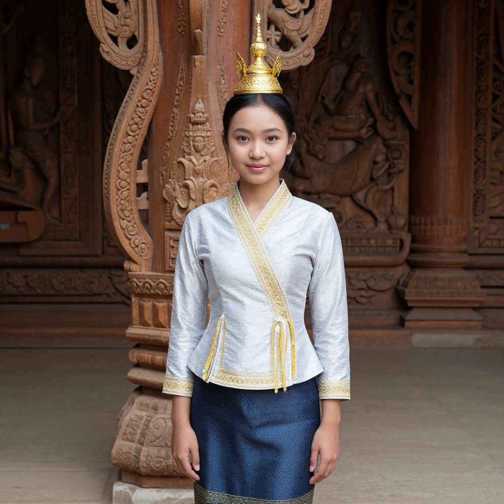Photograph of a young Southeast Asian woman standing in front of an intricately carved wooden temple. She has a medium skin tone, black hair pulled back, and wears a silver blouse with gold embroidery and a matching gold crown adorned with small decorative elements. She's also wearing dark blue, textured pants. The background features detailed wooden sculptures and steps. The scene is well-lit, highlighting the textures and colors.