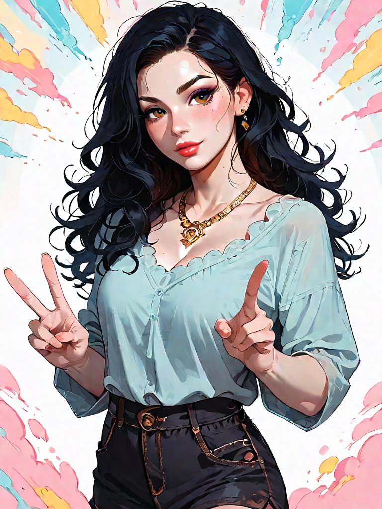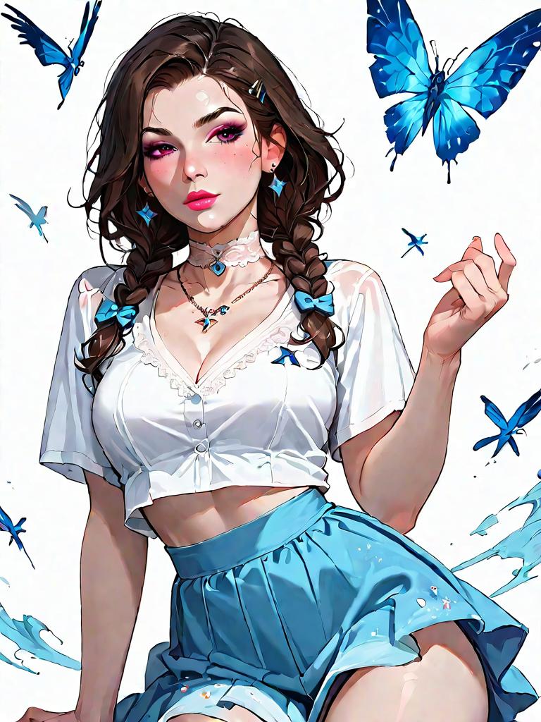 1girl, source_comics, realistic face, full body shot, Woman, edgy streetwear, white crop top with bold lettering, high-waisted blue glittery skirt with white faux fur trim, choker necklace with heart charm, brown hair in twin braids, white studio background