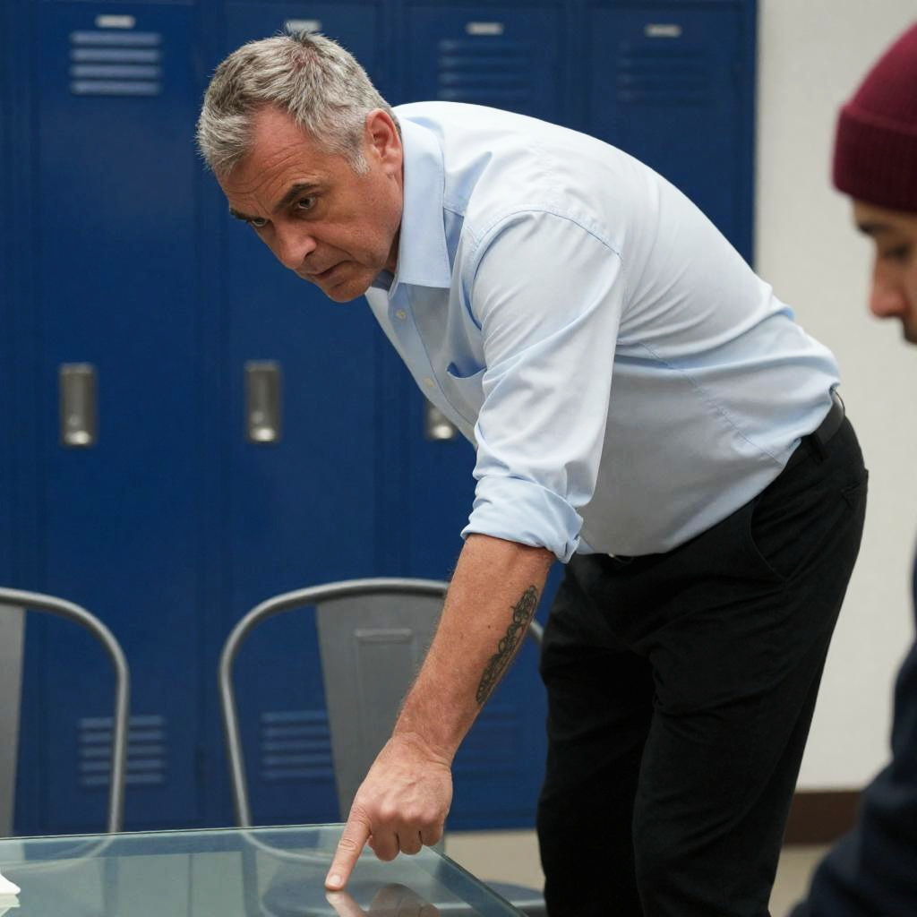 Middle-aged man with gray hair, light blue shirt, black pants, leaning forward, pointing at a glass on a table. Blue locker in background, metal chairs, indoor setting. Visible tattoo on left forearm. Intense facial expression. One other person partially visible, wearing red beanie.
