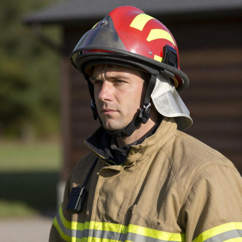 Photograph of a man in a firefighter's uniform kneeling on a wooden floor, holding a rifle over a person in a red jacket and blue jeans lying on the ground. The background includes a wooden cabinet, a pink tricycle, and scattered toys. The man's expression is focused and concerned.
