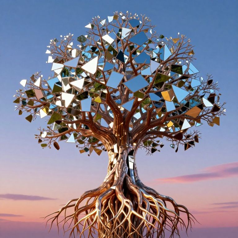 A surreal 3D-rendered tree composed of fragmented, reflective mirror-like pieces stands against a vibrant sky, its intricate roots glowing warmly as they intertwine beneath, creating a mesmerizing blend of digital artistry and natural beauty.