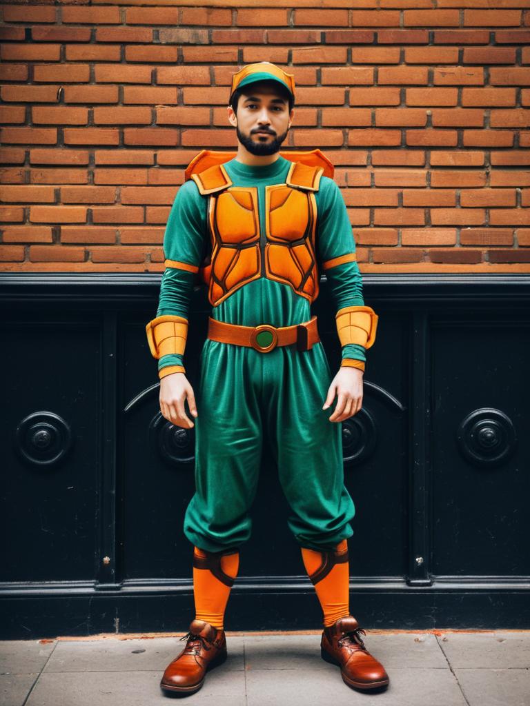 Man cosplay. Wearing Michelangelo (2012) costume. Realistic photo. Dressed as Michelangelo (2012) --sref 1392