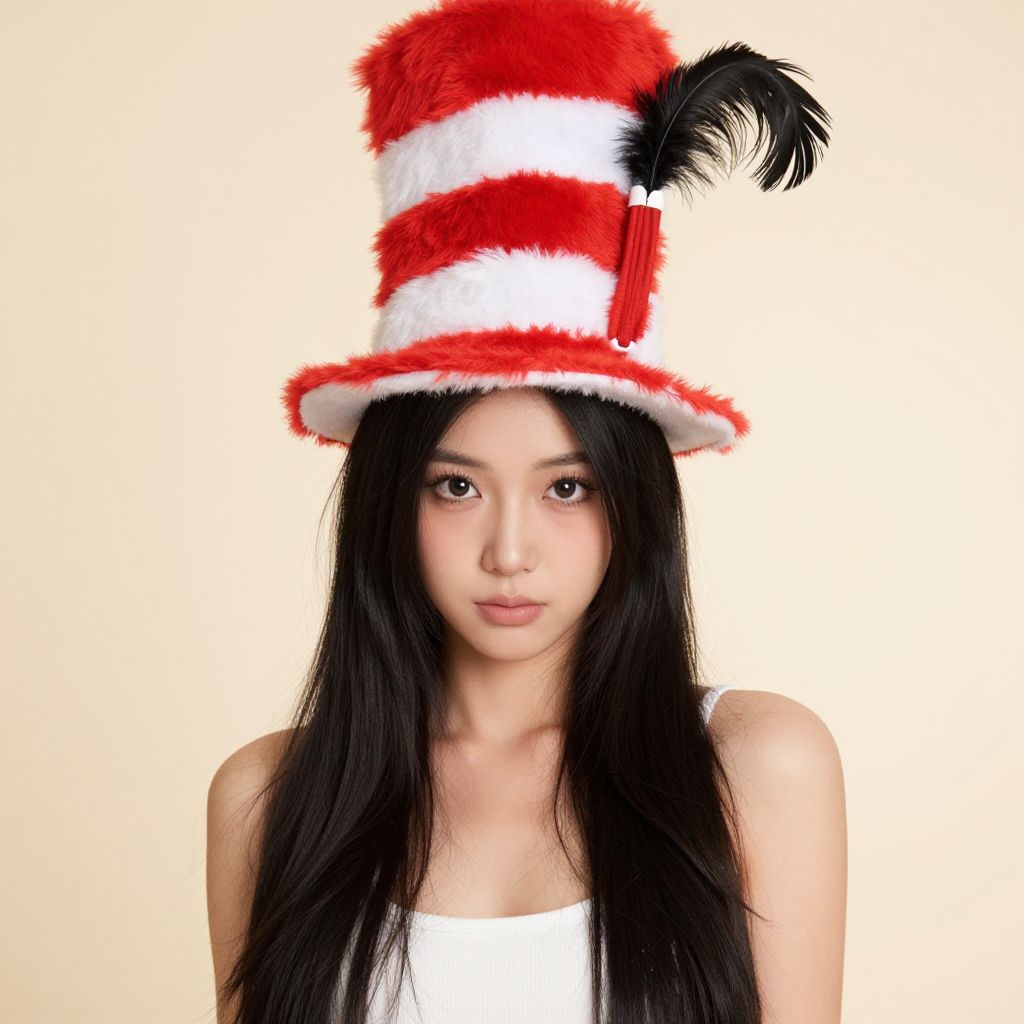 "seussical costume, 1girl, solo, black hair, looking at viewer, upper body, tassel, hat, closed mouth, hat feather Realistic photo of casual sexy person with pretty face"