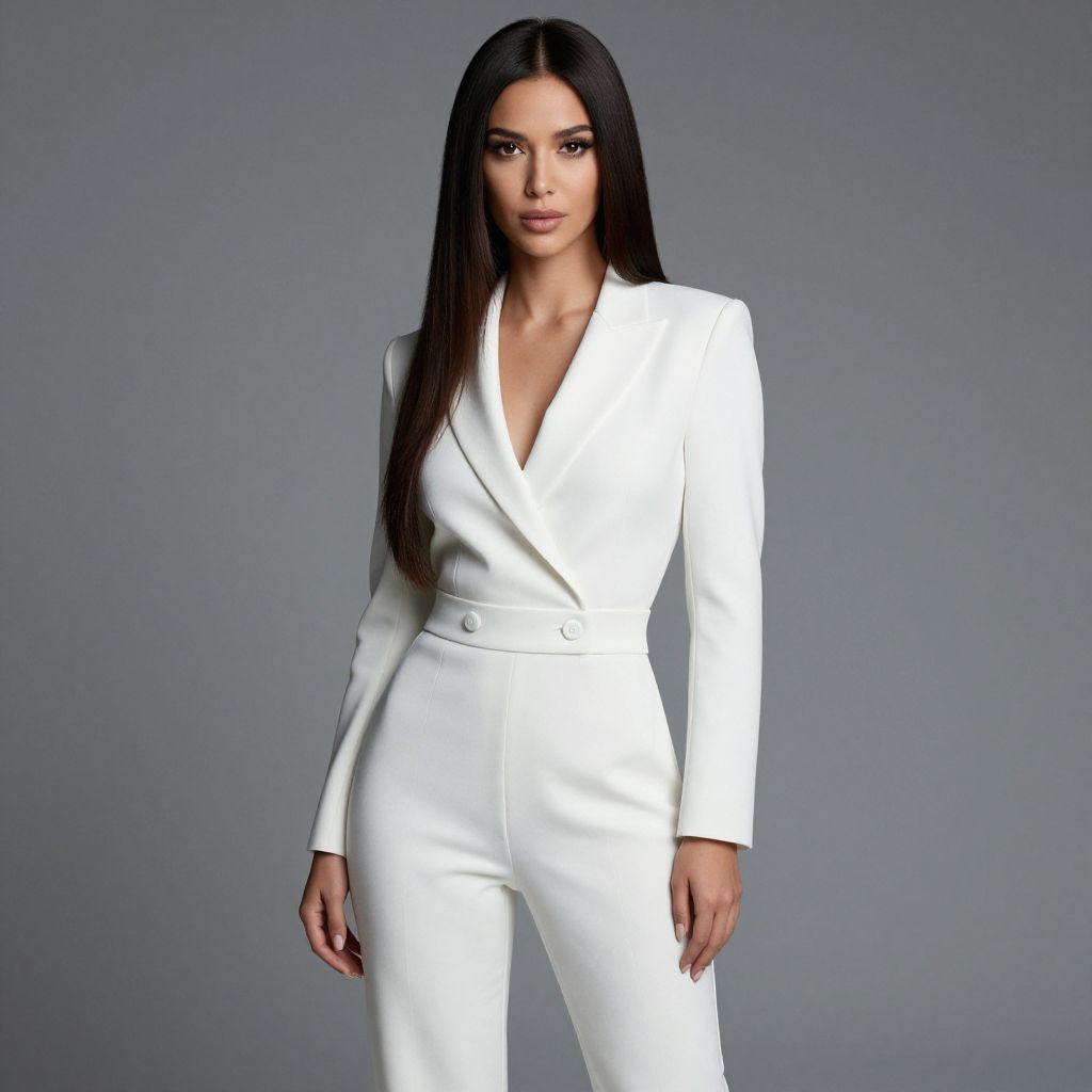 The image features a stunning woman in a fashionable white jumpsuit, exuding confidence and elegance. Her long, straight hair and poised demeanor against a minimalist background highlight contemporary fashion aesthetics.
