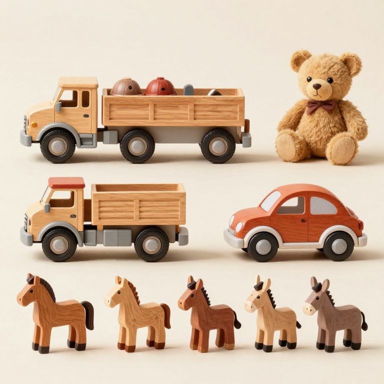 Arranged neatly on a light background, a vibrant collection of wooden toys showcases six distinct vehicles, including trucks and cars, alongside five charming animal figures—horses and donkeys—and a teddy bear, all rendered in warm earthy tones with intricate details and playful expressions.