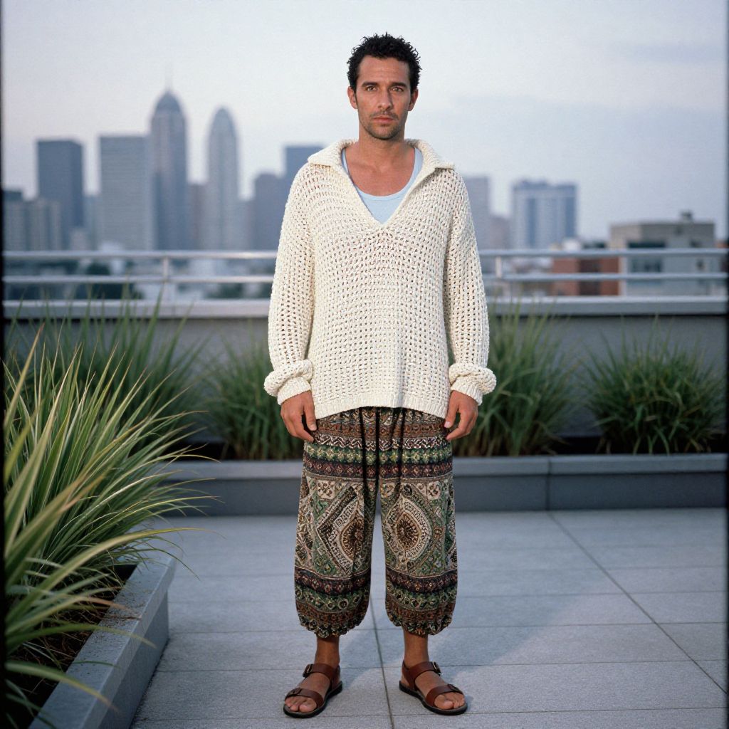 A man, breezy oversized crochet-knit pullover, off-white, light blue tank top, patterned palazzo pants, earthy greens and browns, comfortable leather sandals, rooftop oasis, city skyline backdrop, Holga camera style, relaxed expression, enjoying the view. Man has masculine face and piercing eyes