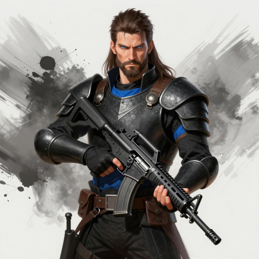 Digital illustration of an older man with grey hair, standing confidently. He holds a black gun in his right hand, raised. Wearing a beige shirt, dark vest, black pants, brown belt, and black boots. A holster with a small revolver is on his left hip. Background is dark grey. His face shows determination. His left arm is relaxed by his side. The man stands with his weight on his right leg. He has a muscular build. The overall style is realistic.