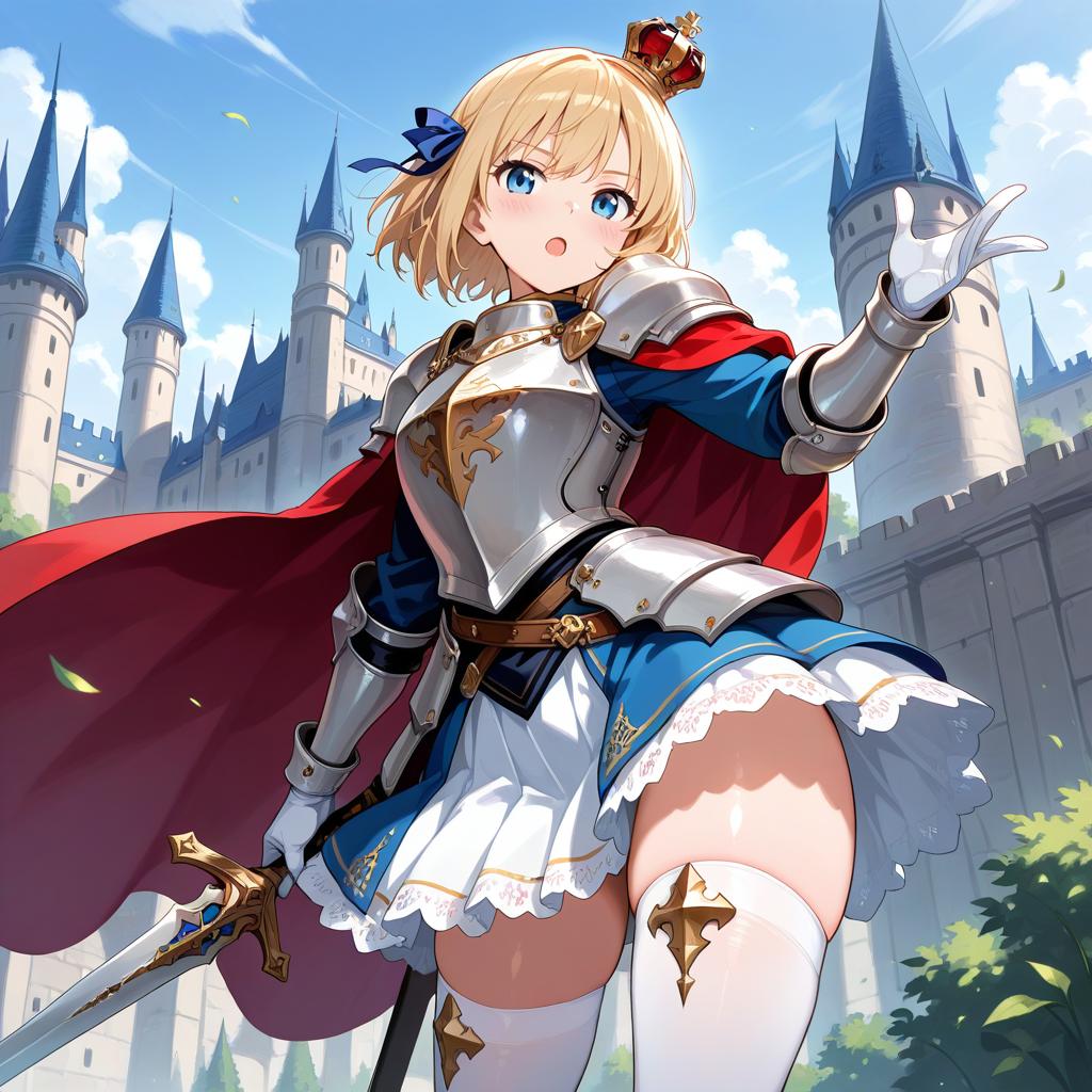1girl, blonde hair, crown, weapon, sword, blue eyes, solo, thighhighs, cape, looking at viewer, white thighhighs, armor, holding sword, holding weapon, holding, castle, mini crown, open mouth, white gloves, red cape, gloves, sky, short hair, cloud, day, ribbon, outdoors, hair ribbon, blush, breastplate, skirt
