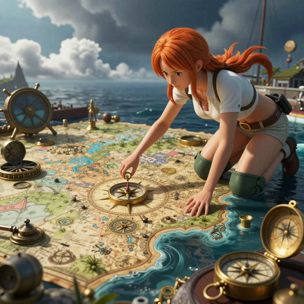 Timeskip nami navigating through a fantasy sea map, intricate compass and nautical instruments, mysterious clouds overhead, adventure and exploration theme, high detail