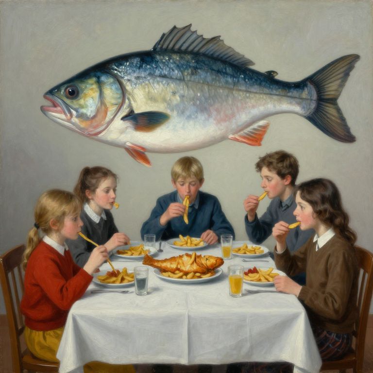 Oil painting of five children eating dinner at a table with a large, realistic fish hovering above them. They are eating fries and drinking orange juice.