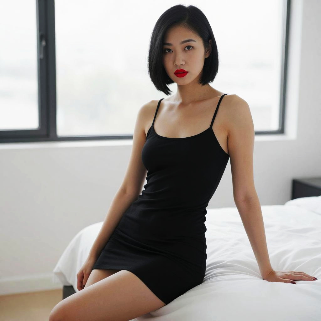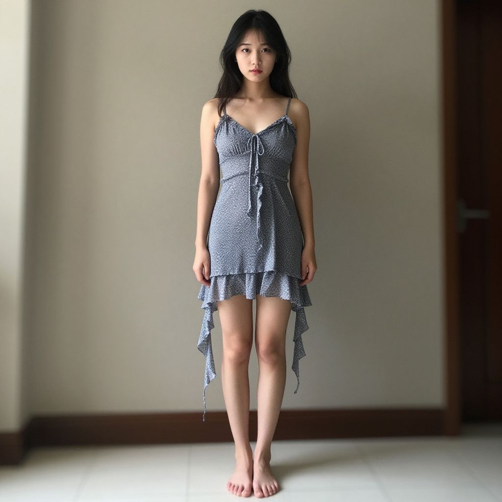 Photograph of an Asian woman with black hair in a bun, wearing a tight, green, sleeveless mini dress and beige sandals, standing against a
