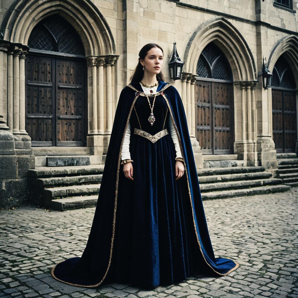 Saints And Sinners Fancy Dress face swap, woman in medieval dress standing in a courtyard with a stone wall